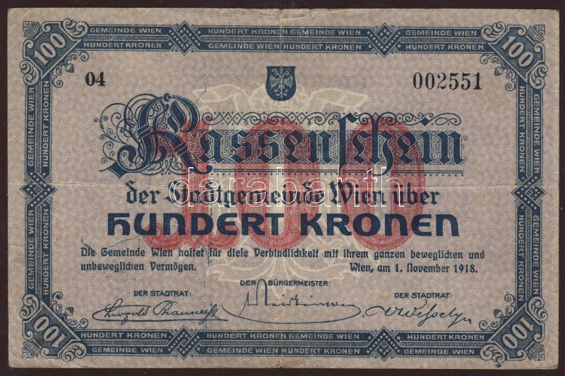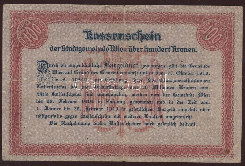 Ausztria / Wien 1918. 100Kr nagyalakú korai szükségpénz T:III https://www.darabanth.com/de/84-Fernauktion/84.0/Numismatik/~325/Ausztria-Wien-1918-100Kr-nagyalaku-korai-szuksegpenz-TIII~II178788