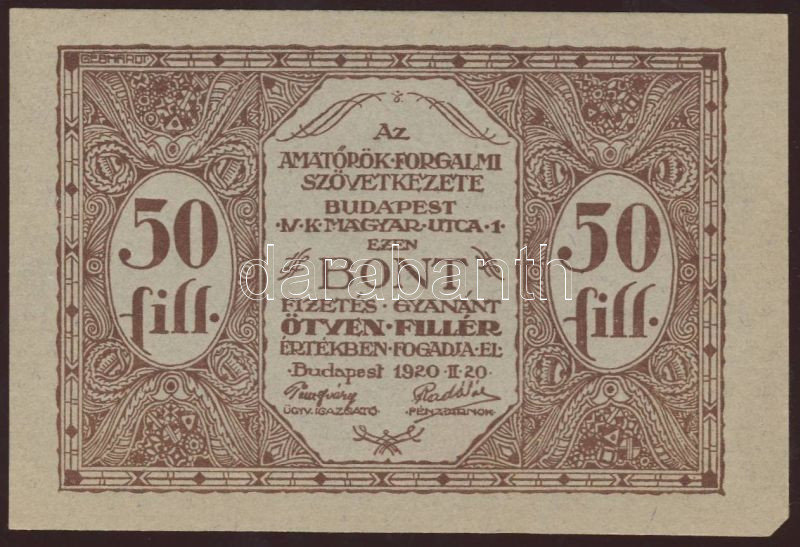 Beschreibung: Budapest 1920. "Az Amatőrök Forgalmi Szövetkezete" 50f T:I-