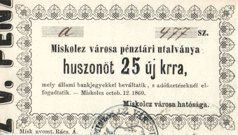 Beschreibung: Miskolc 1860. 25kr T:II+