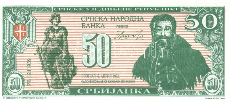 Szerbia 1992. 50Szr fantáziapénz T:I https://www.darabanth.com/de/84-Fernauktion/84.0/Numismatik/~325/Szerbia-1992-50Szr-fantaziapenz-TI~II178065