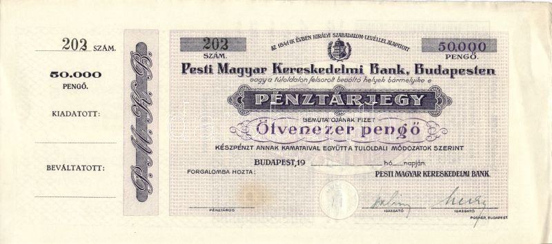 cca. 1941-44. A Pesti Magyar Kereskedelmi Bank pénztárjegye 50000P (bl... https://www.darabanth.com/de/84-Fernauktion/84.0/Numismatik/~325/cca-1941-44-A-Pesti-Magyar-Kereskedelmi-Bank-penztarjegye-50000P-blanko-TIIplus-R~II179855