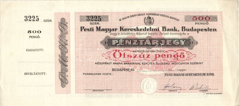 cca. 1941-44. A Pesti Magyar Kereskedelmi Bank pénztárjegye 500P (blan... https://www.darabanth.com/de/84-Fernauktion/84.0/Numismatik/~325/cca-1941-44-A-Pesti-Magyar-Kereskedelmi-Bank-penztarjegye-500P-blanko-TIIplus-R~II179857