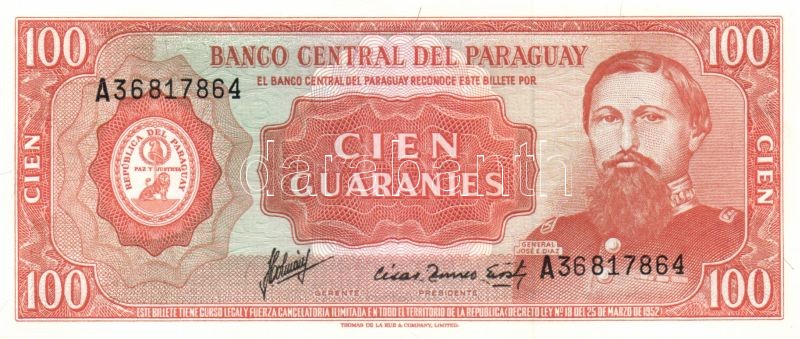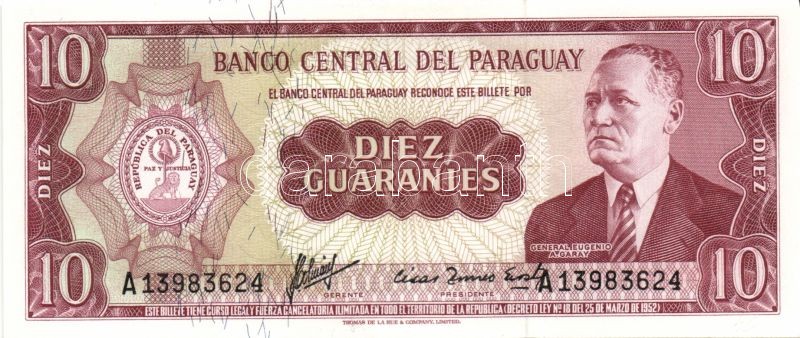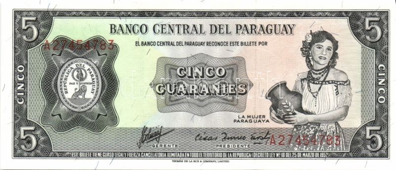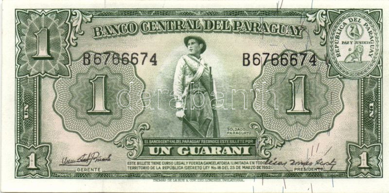 Paraguay 1952. 1G T:I + 1952(1963-). 1G, 5G "fekete", 10G, 50G, 100G "... https://www.darabanth.com/de/84-Fernauktion/84.0/Numismatik/~327/Paraguay-1952-1G-TI-plus-19521963-1G-5G-fekete-10G-50G-100G-narancssarga-TI~II177553