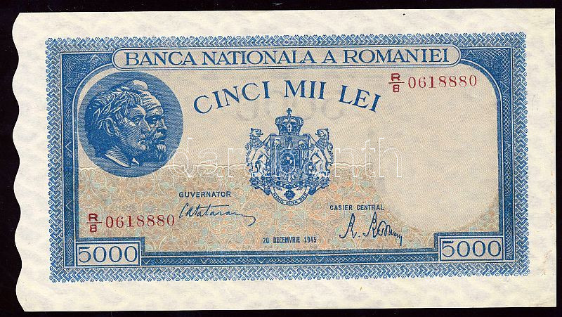 Románia 1945(1944). 5000L T:I https://www.darabanth.com/de/84-Fernauktion/84.0/Numismatik/~327/Romania-19451944-5000L-TI~II177713