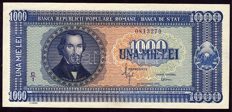 Románia 1950.9.20. 1000L T:I https://www.darabanth.com/de/84-Fernauktion/84.0/Numismatik/~327/Romania-1950920-1000L-TI~II177718