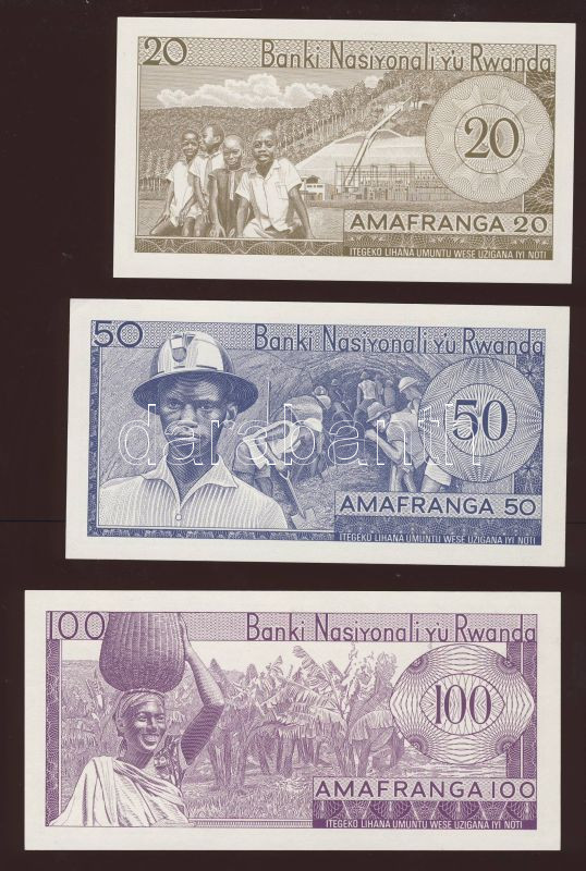 Ruanda 1976.1.1.(1964). 20Fr, 50Fr, 100Fr egy kivételével komplett sor... https://www.darabanth.com/de/84-Fernauktion/84.0/Numismatik/~327/Ruanda-1976111964-20Fr-50Fr-100Fr-egy-kivetelevel-komplett-sor-TI~II177762