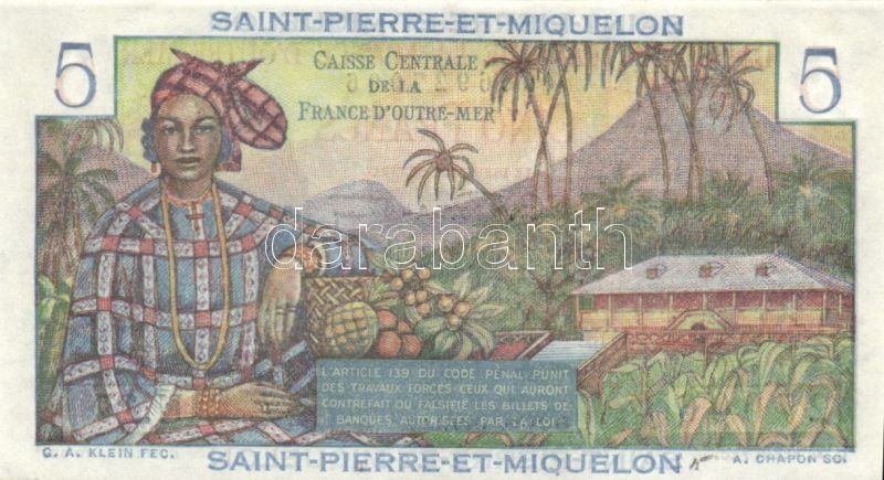St.Pierre & Miquelon 1950-60. 5Fr T:I https://www.darabanth.com/de/84-Fernauktion/84.0/Numismatik/~327/StPierre-Miquelon-1950-60-5Fr-TI~II177785