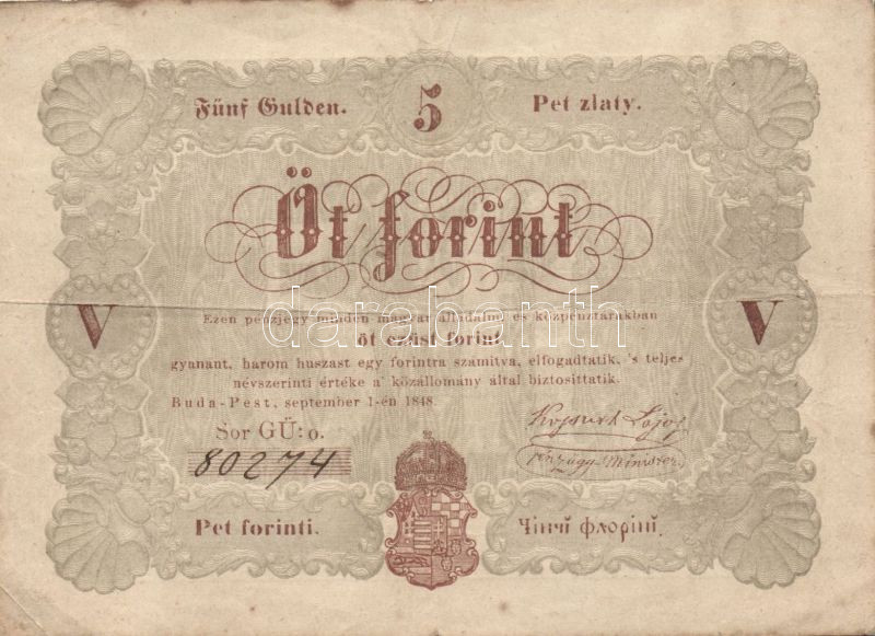 Beschreibung: 1848. 5Ft "Kossuth bankó" barna, "alladalmi" tévnyomattal T:II/III+