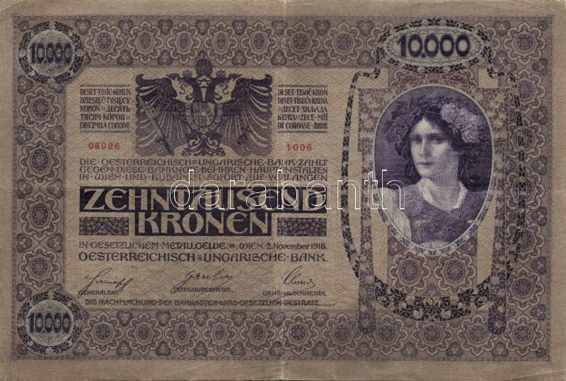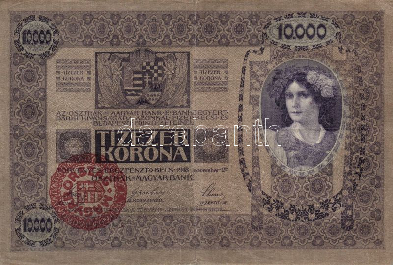 1918. 10000K piros "Magyarország" körbélyegzővel T:II/III https://www.darabanth.com/de/84-Fernauktion/84.0/Numismatik/~328/1918-10000K-piros-Magyarorszag-korbelyegzovel-TIIIII~II178068