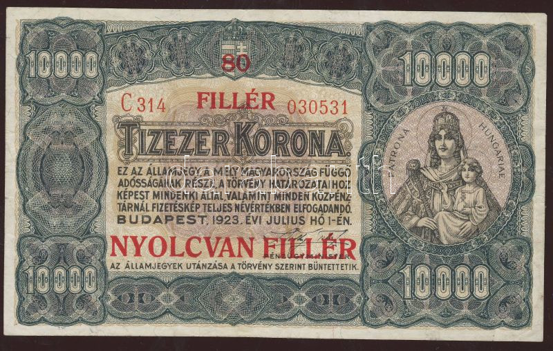 Beschreibung: 1923. 10000K 80f fny-sal, ami erősen lefelé csúszott! T: jól restaurált!