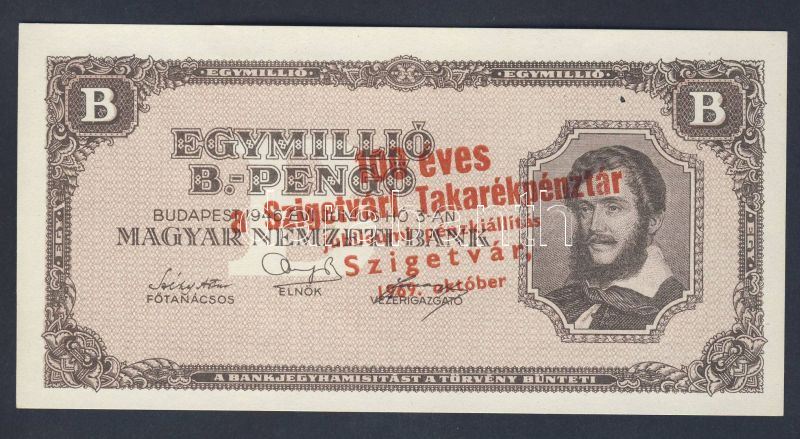 Beschreibung: 1946. 1000000B-pengő "100 éves a Szigetvári Takarékpénztár...1969..." propaganda fny-sal T:I