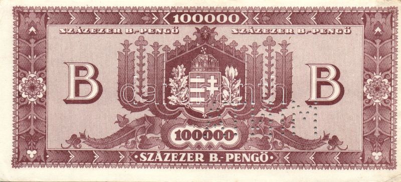 1946. 100000BP "Minta" perforációval T:I- foltos https://www.darabanth.com/de/84-Fernauktion/84.0/Numismatik/~328/1946-100000BP-Minta-perforacioval-TI-foltos~II179828