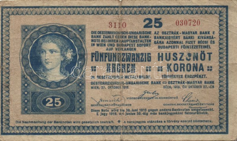 1918. 25K "sima" "3110" sorozatszámmal T:III https://www.darabanth.com/de/85-Fernauktion/85.0/Numismatik/~531/1918-25K-sima-3110-sorozatszammal-TIII~II184169