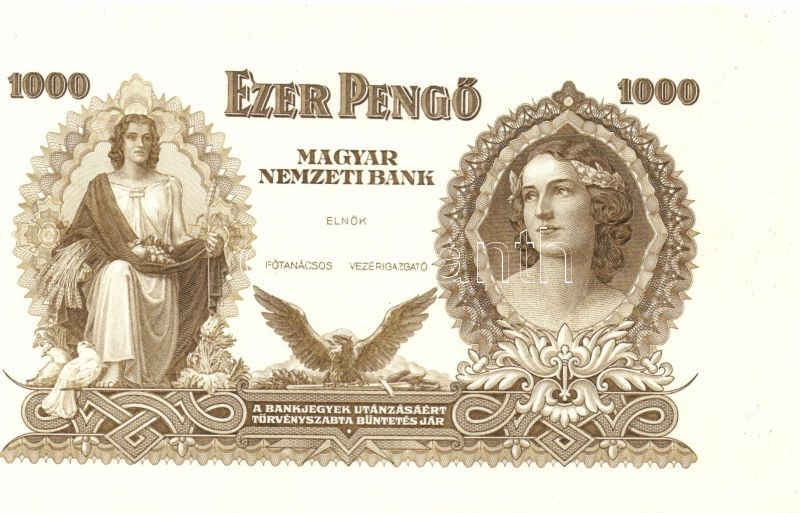 1942. 1000P Horváth E. terve, dátum nélkül, hivatalos utánnyomat, csak... https://www.darabanth.com/de/85-Fernauktion/85.0/Numismatik/~531/1942-1000P-Horvath-E-terve-datum-nelkul-hivatalos-utannyomat-csak-600db-RR-Rosszul-vag~II184154
