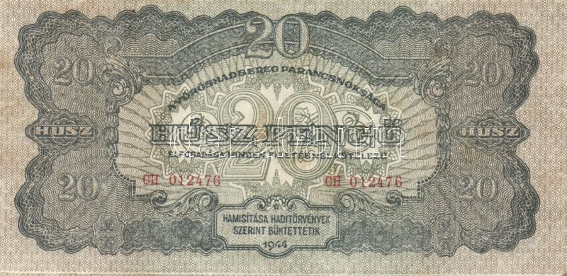 Beschreibung: 1944. "V.H." 20P hátoldali erősen balra és felfelé csúszott nyomat + alul erős vastag fehér csík! T:II