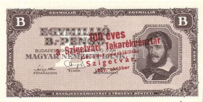 Beschreibung: 1946. 1000.000B.-pengő piros "100 éves a Szigetváti Takarékpénztár...1969" fny-sal T:I