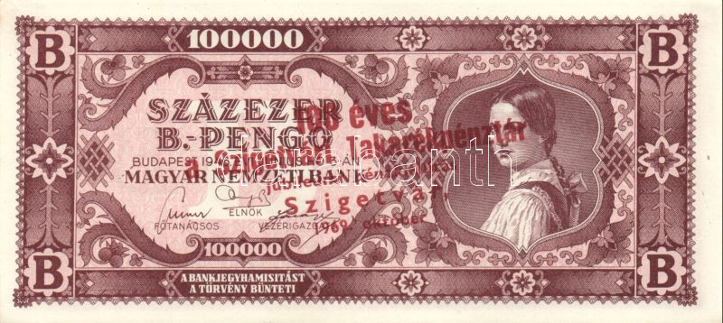 Beschreibung: 1946. 100.000B.-pengő piros "100 éves a Szigetváti Takarékpénztár...1969" fny-sal T:I