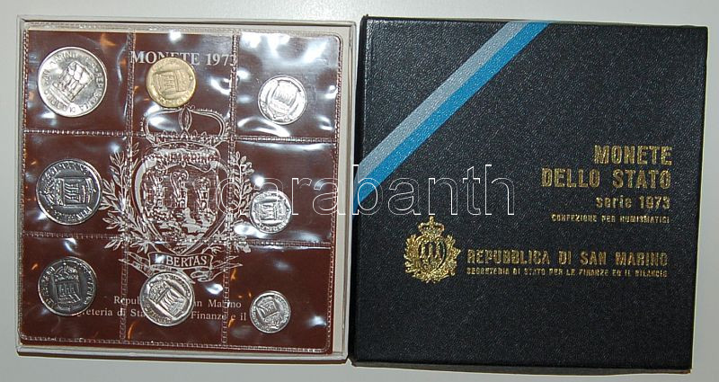 San Marino 1973. 1L-500L 8klf db, forgalmi szettben, benne Ag T:1 Dísz... https://www.darabanth.com/de/85-Fernauktion/85.0/Numismatik/~540/San-Marino-1973-1L-500L-8klf-db-forgalmi-szettben-benne-Ag-T1-Diszdobozban-tanusitvannyal-~II181150