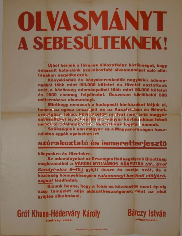 1915 I. világháborús hirdetmény katonáknak könyvadományok gyűjtéséről ... https://www.darabanth.com/de/86-Fernauktion/86.0/Andere-Sammelgebiete/~288/1915-I-vilaghaborus-hirdetmeny-katonaknak-konyvadomanyok-gyujteserol-50x60-cm~II185032