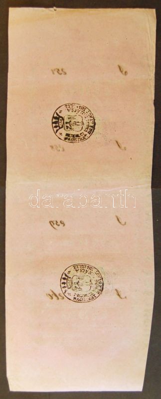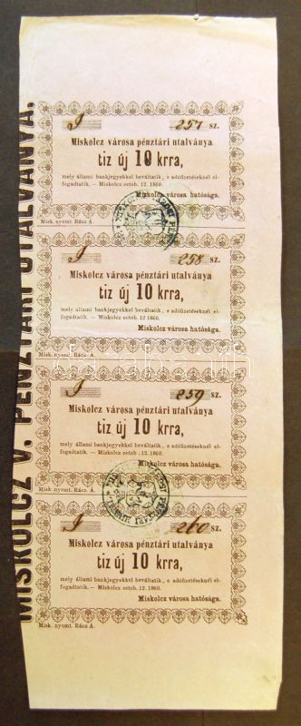 Miskolc 1860. 10kr rózsaszín papíron 4-es függőleges ívben, egymásutáni sorszámokkal, következő lemezhibákkal felülről lefelé: 1.bankjegy elmázolt "M" betű + "10" számban eltömődött "O", 2. bankjegy "12" után nincs pont, 3. bankjegy "octob" után szünet és pont + "Misk" "k" betűje ferde és nincs utána pont, "új" "j" betűje alul eltömődve T:I