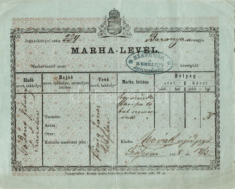 1868 Marhalevél "Szászvár Kerületi jegyzőség" https://www.darabanth.com/de/88-Fernauktion/88.0/Andere-Sammelgebiete/~317/1868-Marhalevel-Szaszvar-Keruleti-jegyzoseg~II140097