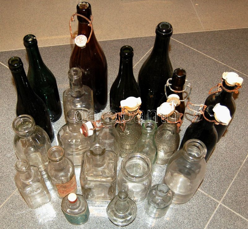 Beschreibung: Érdekes üveg tétel: 23 klf üveg a múlt század elejéről (sörös-, gyógyszeres üvegek, csatosüvegek)