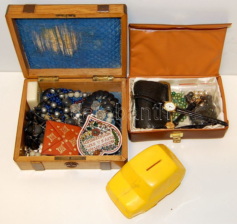 Beschreibung: 11db üveggyöngy és műanyag nyaklánc + 2db női karóra + régi női pénztárca + porcelán tálka 1943-ból + szattyánbőr ékszertartó + 1db ékszertartó díszdoboz + 1db műanyag kisautó alakú persely + egyéb apróságok 2db klf régi ékszertartó dobozban