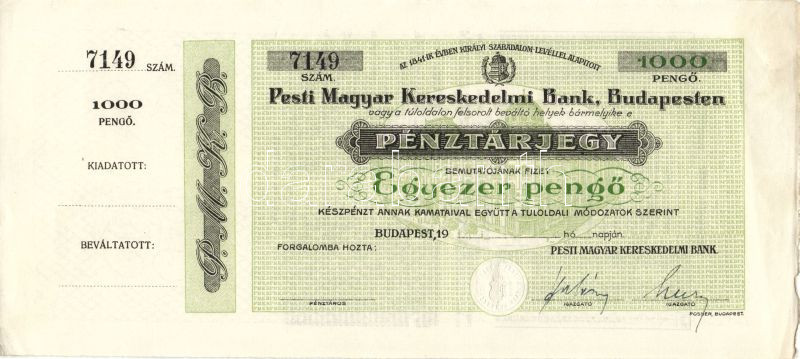 1941-44. A Pesti Magyar Kereskedelmi Bank pénztárjegye 1000P-ről (blan... https://www.darabanth.com/de/88-Fernauktion/88.0/Numismatik/~335/1941-44-A-Pesti-Magyar-Kereskedelmi-Bank-penztarjegye-1000P-rol-blanko-szelvennyel-TI-~II192427