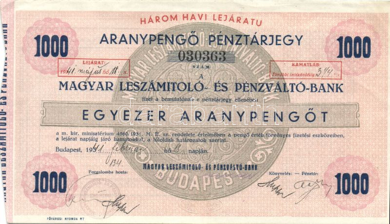 1941. A Magyar Leszámítoló- és Pénzváltó Bank pénztárjegye 1000 Aranyp... https://www.darabanth.com/de/88-Fernauktion/88.0/Numismatik/~335/1941-A-Magyar-Leszamitolo-es-Penzvalto-Bank-penztarjegye-1000-Aranypengorol-TI-~II192418