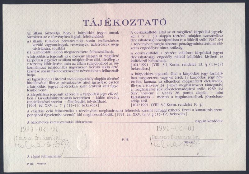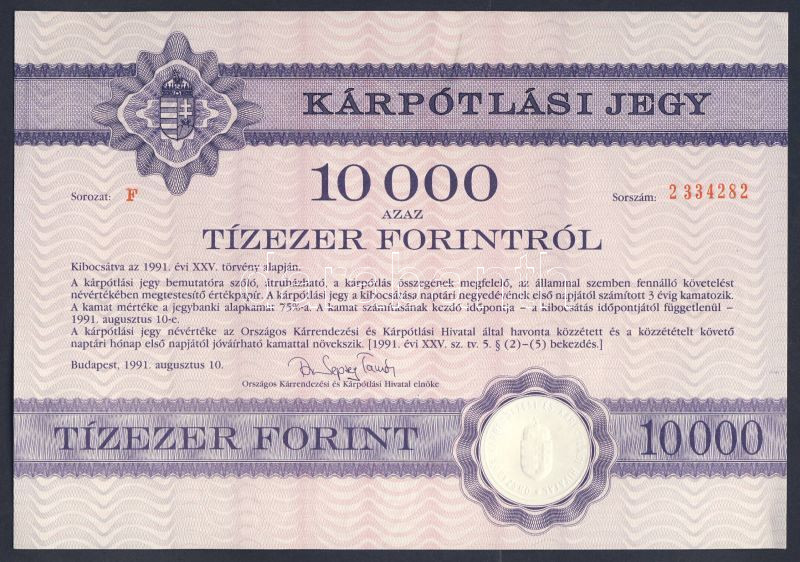 1991. "Kárpótlási jegy" 10.000Ft-ról https://www.darabanth.com/de/88-Fernauktion/88.0/Numismatik/~335/1991-Karpotlasi-jegy-10000Ft-rol~II191180