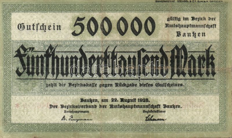 Német Birodalom/Weimari Köztársaság/Bautzen 1923. 500.000M nagyalakú s... https://www.darabanth.com/de/88-Fernauktion/88.0/Numismatik/~335/Nemet-BirodalomWeimari-KoztarsasagBautzen-1923-500000M-nagyalaku-szuksegpenz-TIIIII~II192539