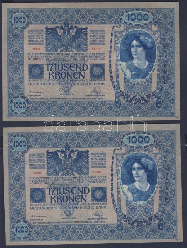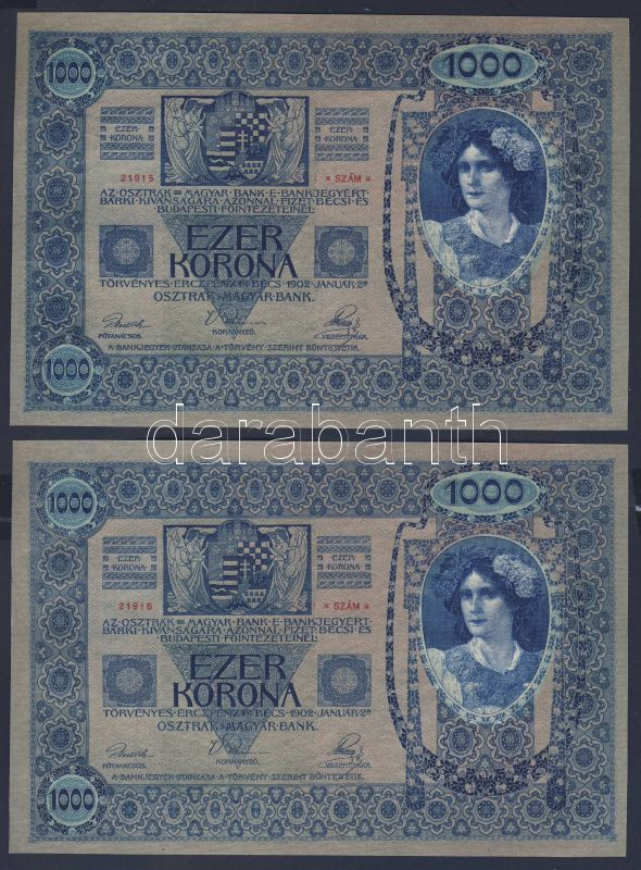 1902. 1000K (2X) egymásutáni sorszámokkal T:I https://www.darabanth.com/de/88-Fernauktion/88.0/Numismatik/~336/1902-1000K-2X-egymasutani-sorszamokkal-TI~II192711
