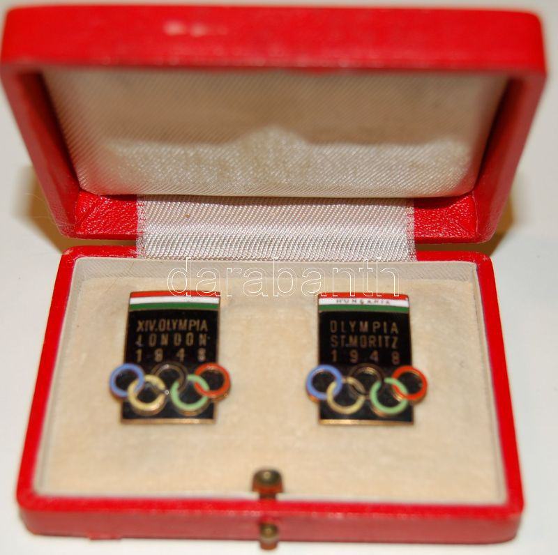 1948. Londoni nyári + St.Moritz-i téli olimpia zománcozott kitűzői egy... https://www.darabanth.com/de/88-Fernauktion/88.0/Numismatik/~337/1948-Londoni-nyari-plus-StMoritz-i-teli-olimpia-zomancozott-kituzoi-egy-diszdobozban-T1~II192553