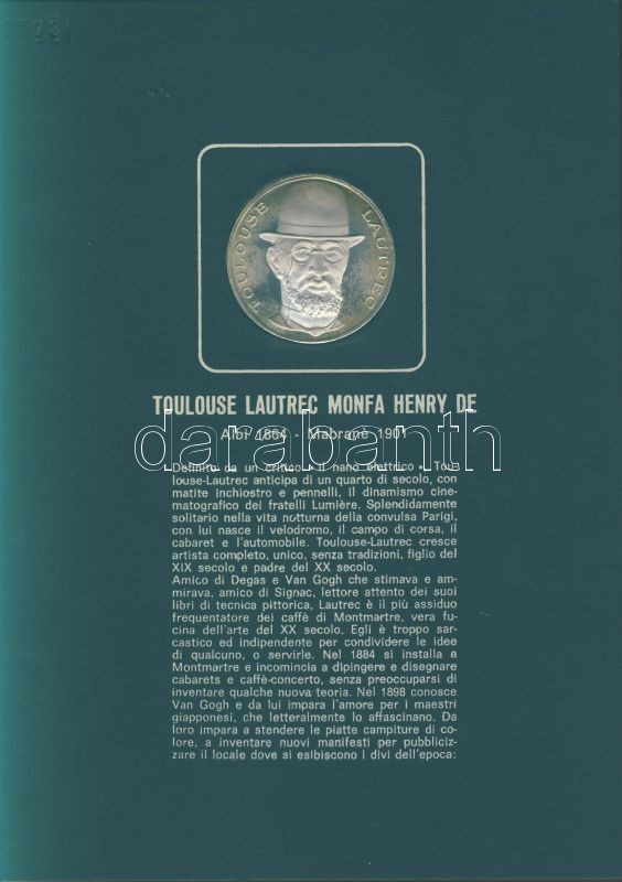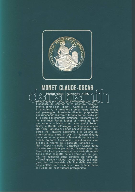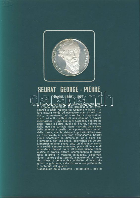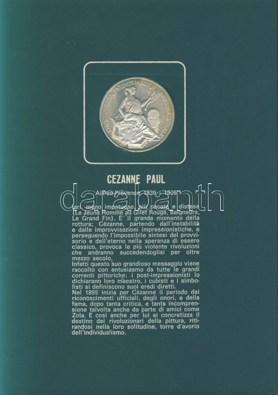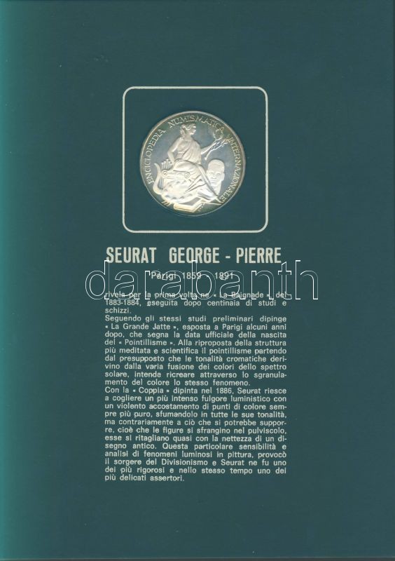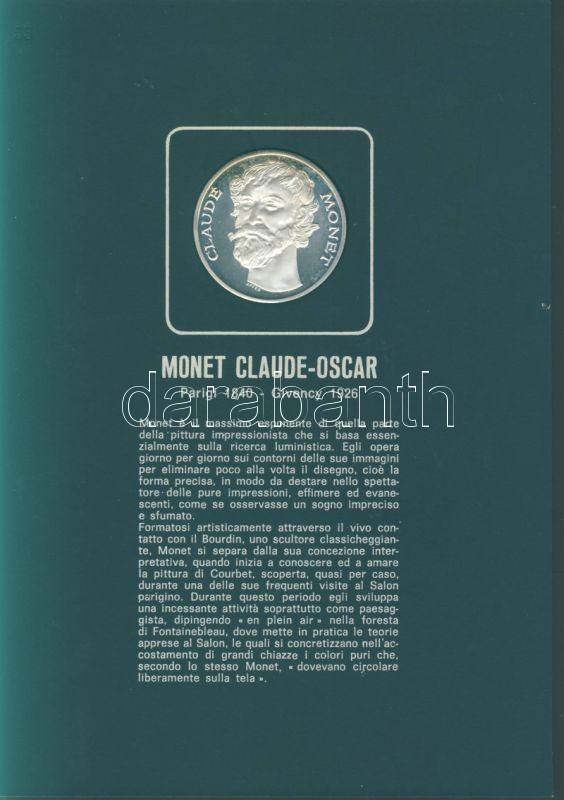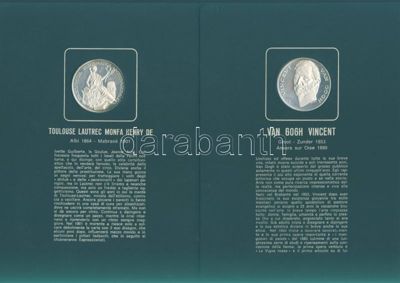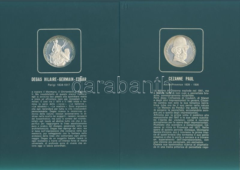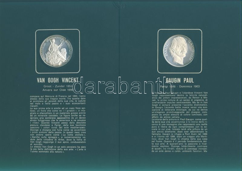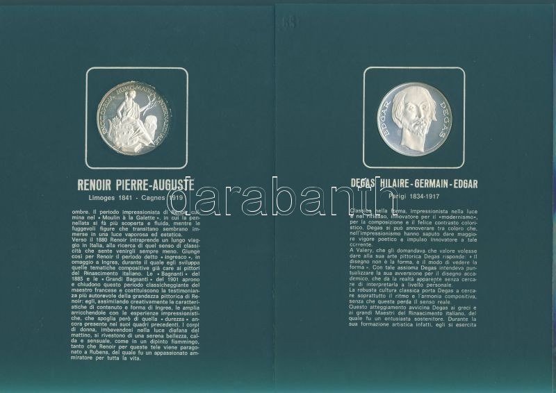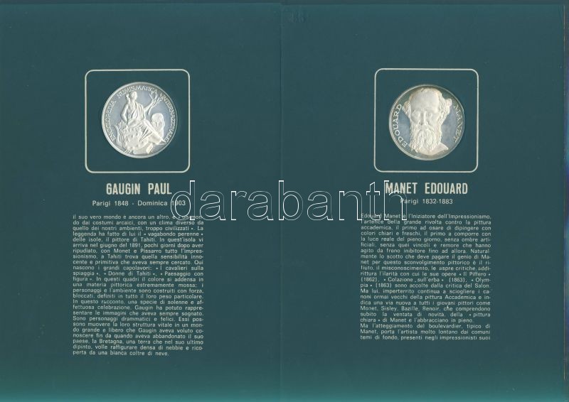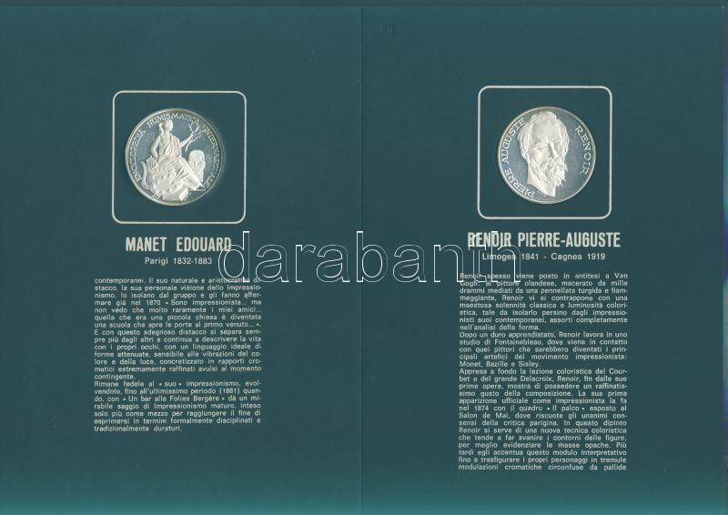 Olaszország "Impresszionista festők" Ag emlékérem-sorozat, 25,1g/db (össz. 225,9g), díszkiadásban, albumban, érmenként ismertetővel, benne Seurat, Monet, Toulouse-Lautrec, Van Gogh, Gaugin, Manet, Renoir, Degas, Cezanne összesen 9 klf db T:PP