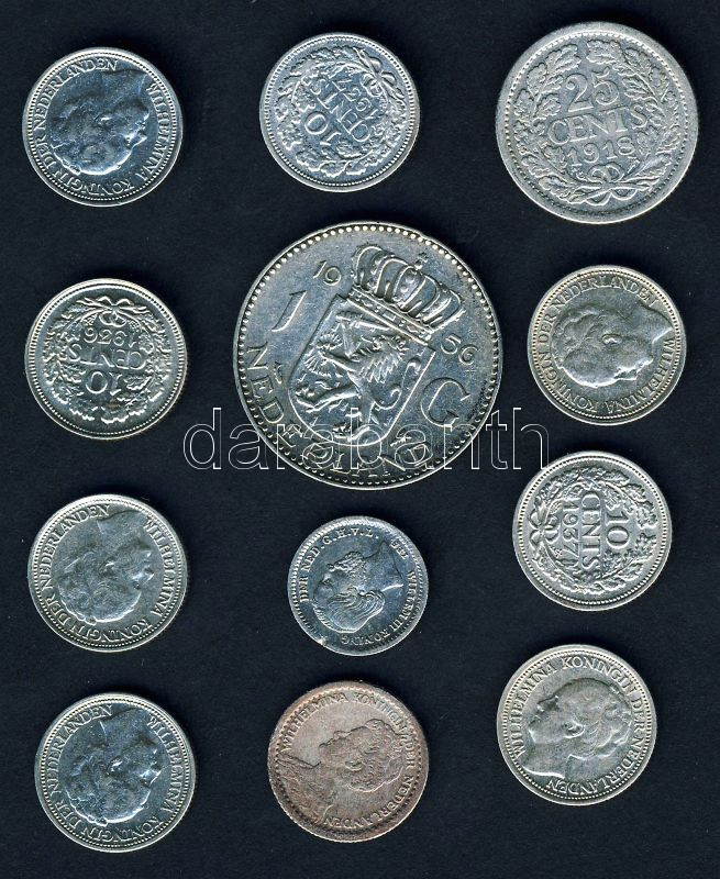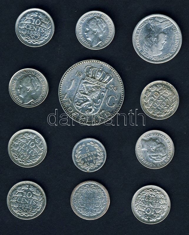 Beschreibung: Hollandia 5c Ag 1850; 10c Ag 1914, 1936, 1937 (2x), 1938 (2x), 1939 (2x), 1941; 25c Ag 1918; 1G Ag 1956 Összesen 12db! T:2,3