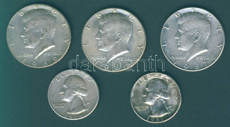 USA 1/4$ Ag 1961,1964 + 1/2$ Ag 1967, 1969D (2x) Összesen 5db (4klf) T... https://www.darabanth.com/de/88-Fernauktion/88.0/Numismatik/~342/USA-14USD-Ag-1961-1964-plus-12USD-Ag-1967-1969D-2x-Osszesen-5db-4klf-T2-2-~II190789