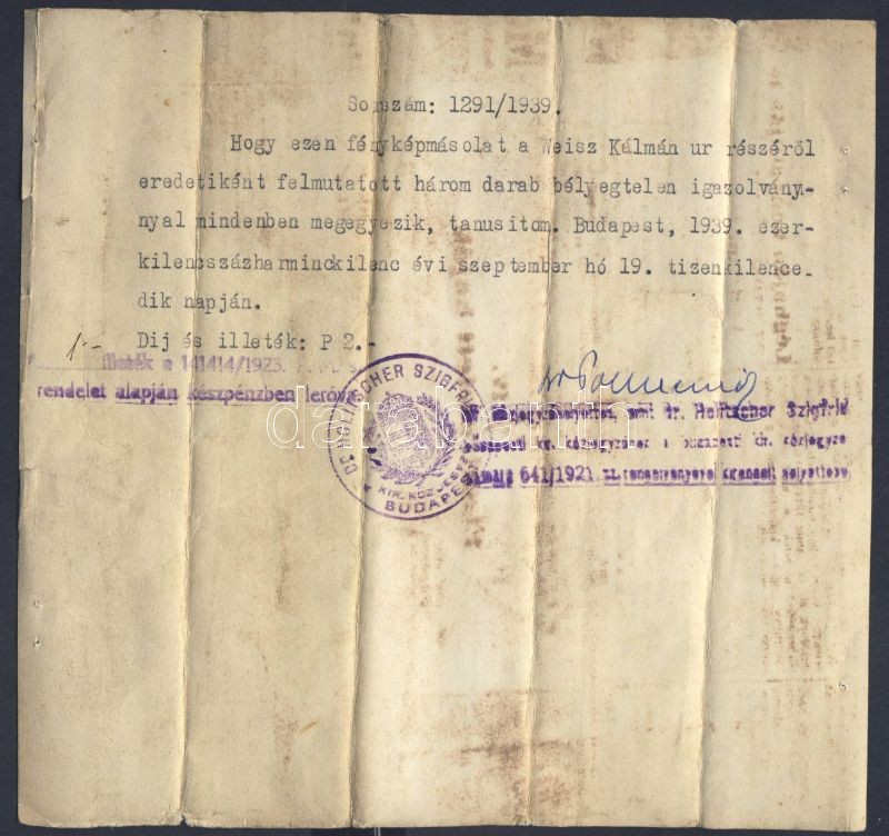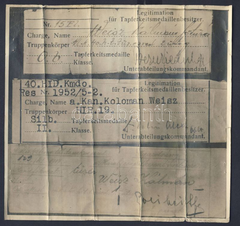 Beschreibung: 1939 I. világháborús Vitézségi érem viselésére jogosító igazolványokról készült hitelesített fotómásolat