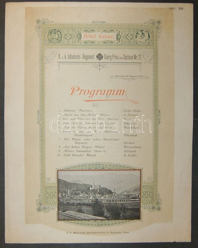 1892 A Hotel Krone (Bruneck, Tirol) bunch-jának szép litho programja R... https://www.darabanth.com/de/89-Fernauktion/89.0/Andere-Sammelgebiete/~1317/1892-A-Hotel-Krone-Bruneck-Tirol-bunch-janak-szep-litho-programja-Rakoczi-induloval-23x28cm-~II196060