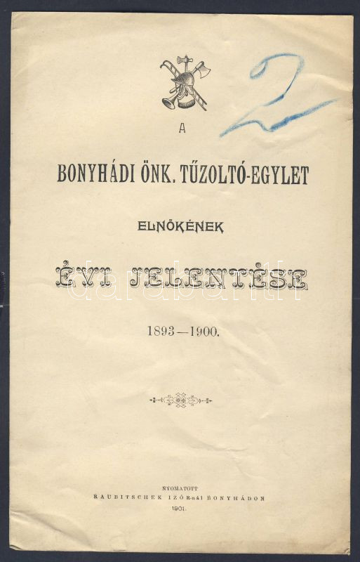 1901 A Bonyhádi Önkéntes Tűzoltóegylet évi jelentése https://www.darabanth.com/de/89-Fernauktion/89.0/Andere-Sammelgebiete/~1384/1901-A-Bonyhadi-Onkentes-Tuzoltoegylet-evi-jelentese~II195871