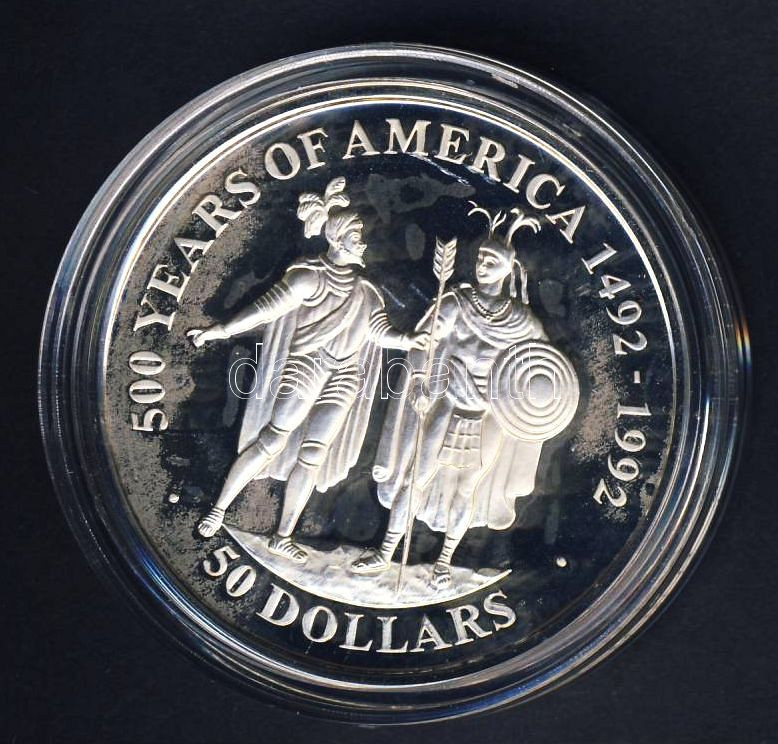 Beschreibung: Cook szigetek 1990. 50$ Ag "Amerika 500 éve-Cortez és Montezuma" T:PP