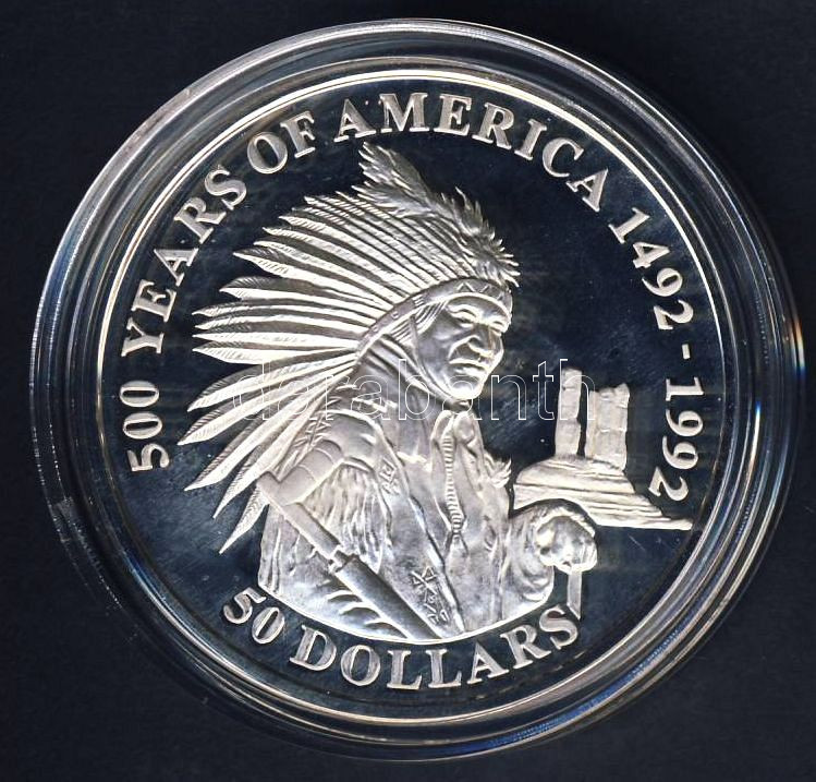 Beschreibung: Cook szigetek 1991. 50$ Ag "Amerika 500 éve-Ülő Bika" T:PP