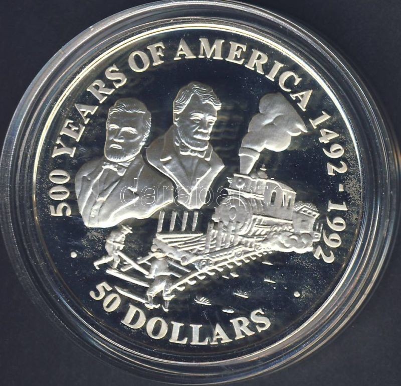 Beschreibung: Cook szigetek 1991. 50$ Ag "Amerika 500 éve-első amerikai transzkontinentális vasút" T:PP