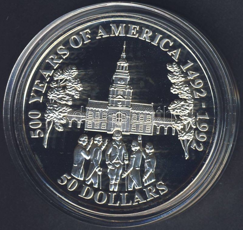 Beschreibung: Cook szigetek 1992. 50$ Ag "Amerika 500 éve-Independence Hall" T:PP