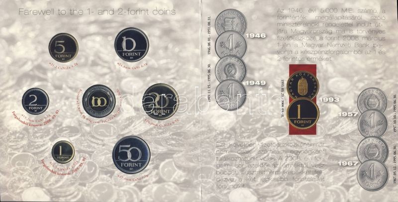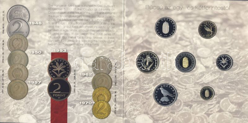2008. 1Ft-100Ft 7 klf db "Búcsú az egy, -és kétforintosoktól" díszes s... https://www.darabanth.com/de/89-Fernauktion/89.0/Numismatik/~1403/2008-1Ft-100Ft-7-klf-db-Bucsu-az-egy--es-ketforintosoktol-diszes-szettben-TPP-csak-4000db~II193079