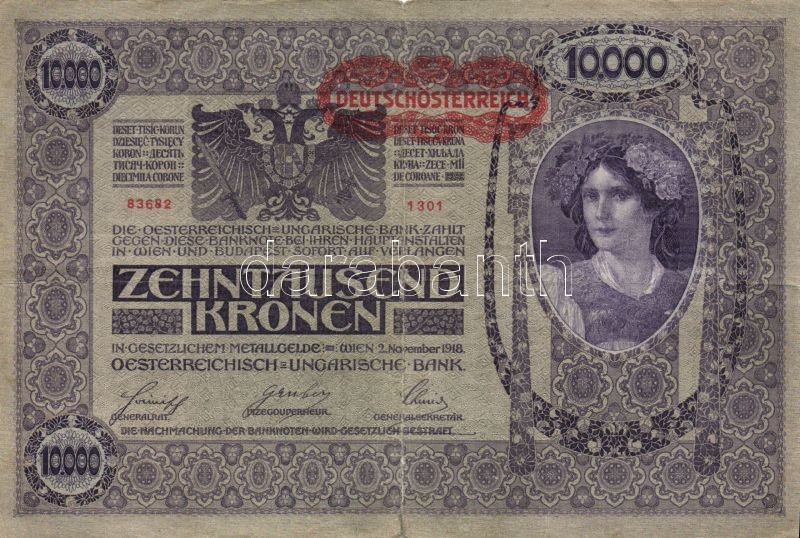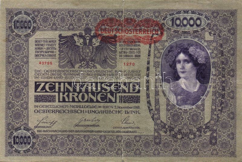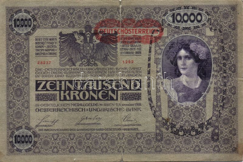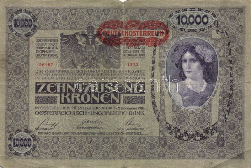 Ausztria 1918. Osztrák-Magyar Bank kiadása 10000K piros "Deutschösterr... https://www.darabanth.com/de/89-Fernauktion/89.0/Numismatik/~1406/Ausztria-1918-Osztrak-Magyar-Bank-kiadasa-10000K-piros-Deutschosterreich-fny-sal-6x-TIII-II~II193102