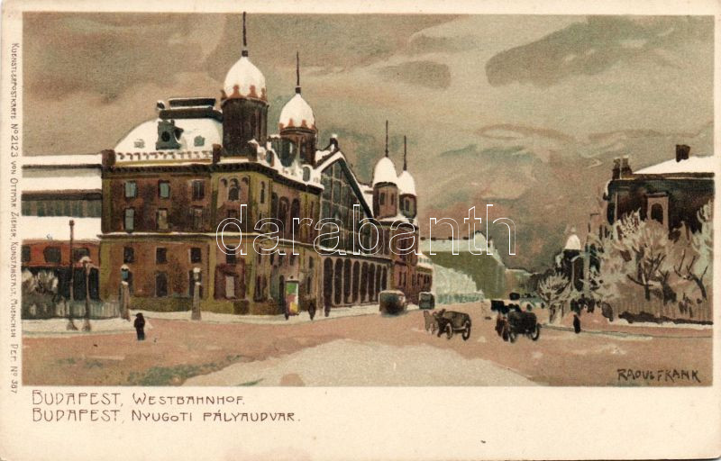 Budapest VI. Nyugati pályaudvar Litho s: Raoul Frank https://www.darabanth.com/de/9-Gross-Auktion/9.1/Ansichtskarten-Ungarn/~2270/Budapest-VI-Nyugati-palyaudvar-Litho-s-Raoul-Frank~II246445