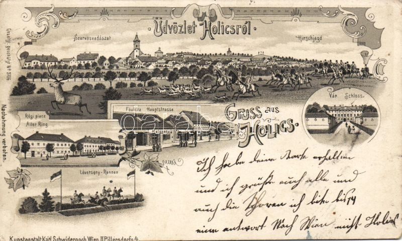1899 Holics with horse race and hunting Litho (EK) https://www.darabanth.com/de/9-Gross-Auktion/9.1/Ansichtskarten-Ungarn/~2273/1899-Holics-with-horse-race-and-hunting-Litho-EK~II246489