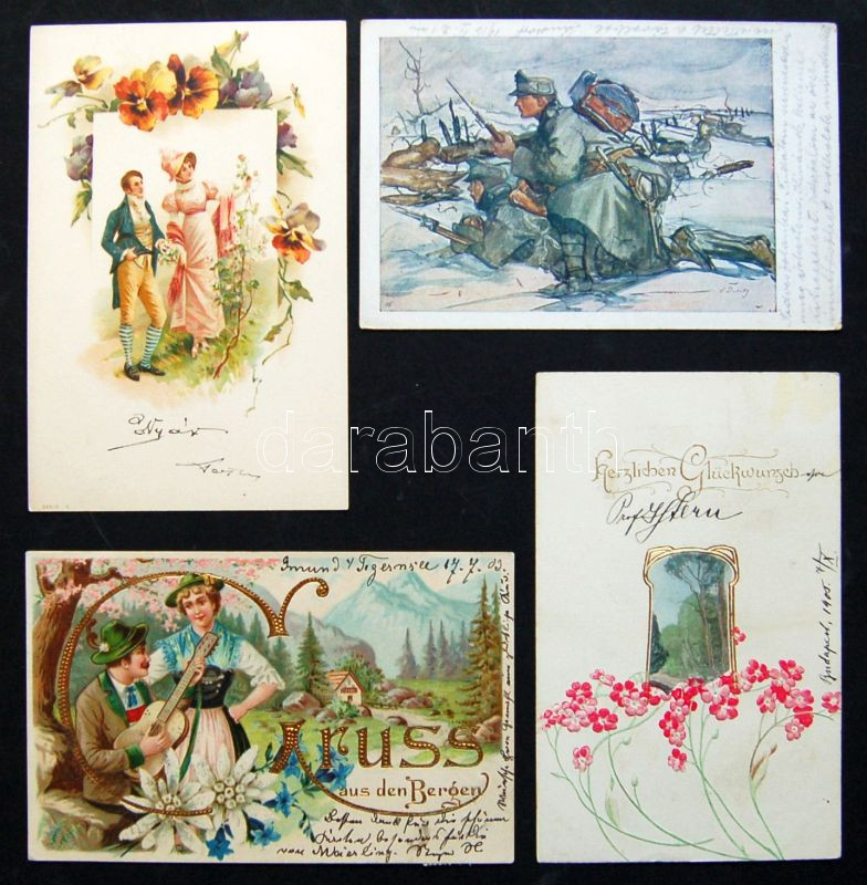 220 db vegyes motívum lap jó motívumokkal, lithokkal, dombornyomású lapokkal benne üdvözlők, művészlapok, katonai, reklám stb / 220 thematic cards with lithos, embossed cards, greeting, artist signed, military, advertising etc.