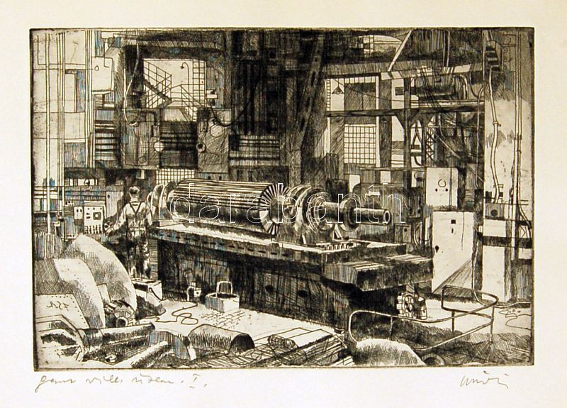 Beschreibung: Würtz Ádám (1927-1994): Ganz villamos üzem I., szignált rézkarc 28x40cm