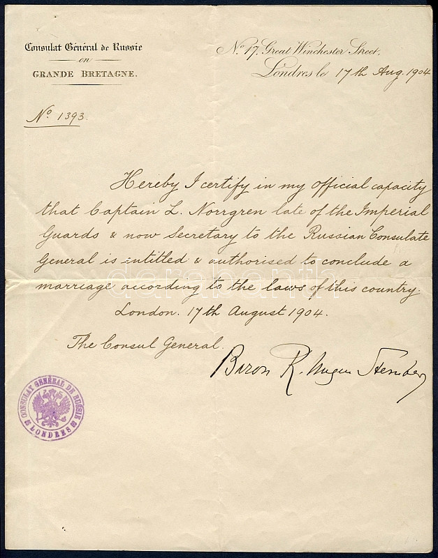 1904 A londoni orosz konzul által kiállított okirat a konzulátus pecsé... https://www.darabanth.com/de/90-Fernauktion/90.0/Andere-Sammelgebiete/~778/1904-A-londoni-orosz-konzul-altal-kiallitott-okirat-a-konzulatus-pecsetes-levelpapirjan~II197780